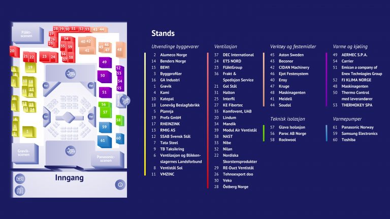 AERMEC S.P.A. Varme og kjøling Alumeco Norge AS Utvendige byggevarer Aston Sweden Verktøy og festemidler Beconor AS Verktøy og festemidler Benders Norge AS Utvendige byggevarer BEWI Utvendige byggevarer Byggprofiler AB Utvendige byggevarer Carrier AB Varme og kjøling CIDAN Machinery AB Maskinleverandør DEC International Ventilasjon Ejot Festesystem AS Verktøy og festemidler Emicon a company of Enex Technlogies Group Varme og kjøling Ensy (i Ventistål regi) Ventilasjon ETS NORD AS Ventilasjon FJ KLIMA NORGE AS Varmepumper FläktGroup Ventilasjon Frakt & Spedisjon Service AS Ventilasjon GA Industri AB Utvendige byggevarer Glava Isolasjon Teknisk isolasjon Gol Stål AS Ventilasjon Grøvik Utvendige byggevarer Halton Ventilasjon Interfil As Ventilasjon Kami AB Utvendig byggevarer Katepal AS Utvendige byggevarer KE FIBERTEC Ventilasjon KlimaControl Byggautomasjon Komfovent, UAB Ventilasjon Kruge Verktøy og festemidler Lindum AS Ventilasjon Lonevåg Beslagfabrikk AS Utvendige byggevarer Mandik Ventilasjon Maskinagenten AS Verktøy og festemidler Meidell AS Verktøy og festemidler Modul Air Ventistål Ventilasjon NAST (Norse Advanced Surface Technology)/Industrilakkering Ventilasjon Nibe Ventilasjon Nilan Ventilasjon Nordiska Skorstensprodukter AB (NSP) Ventilasjon Panasonic Norway Varmepumper Paroc AB Norge Teknisk isolasjon Plannja AS Utvendige byggevarer Prefa GmbH Utvendige byggevarer RE-Duct Ventistål Ventilasjon RHEINZINK Utvendige byggevarer RMIG AS Utvendig byggevarer Rockwool Teknisk Isolasjon Samsung Varmepumper Soudal AS Verktøy og festemidler SSAB Svensk Stål AS Exterior building materials Tata Steel Byggsystemer Norway AS Utvendige byggevarer TB Taksikring Utvendige byggevarer Tehnoexport doo Ventilasjon Thermo Control med leverandører (Fiorini, VTS, Cipriani, Mobile, Sanden) Varme og kjøling THERMOKEY SPA Varme og kjøling Toshiba Varmepumper VBL – Ventilasjon og Blikkenslagernes Landsforbund Utvendige byggevarer Veko As Ventilasjon Ventistål Sol Utvendige byggevarer VMZINC (VM BUILDING SOLUTIONS Scandinavia A/S) Utvendig byggevarer ÖSTBERG NORGE AS Ventilasjon
